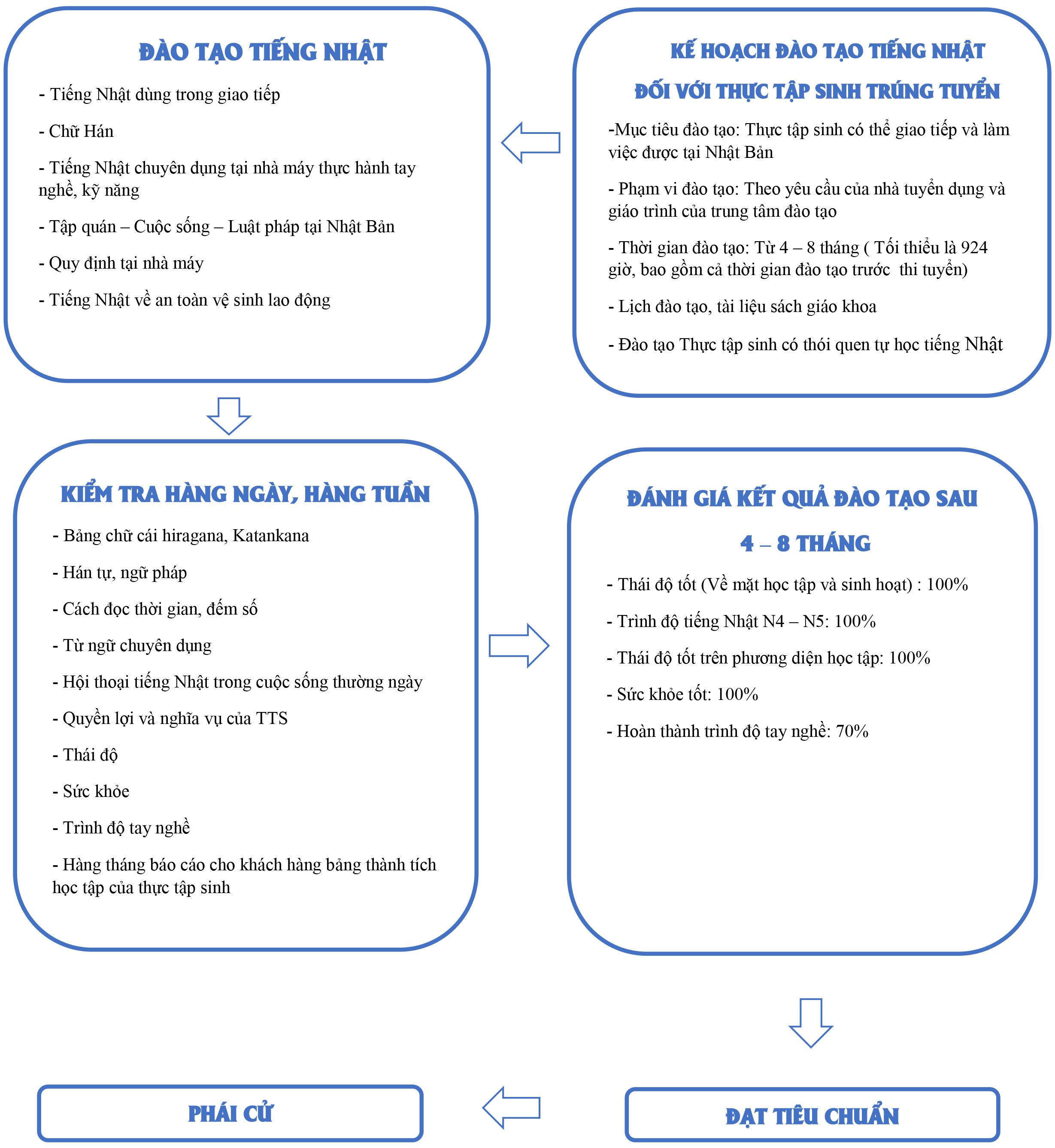 Công ty trách nhiệm hữu hạn Hoàng Xuân Việt thực hiện một chương trình đào tạo tiếng Nhật quy chuẩn cho Thực tập sinh sau trúng tuyển để 95% thực tập sinh đạt được trình độ N5 sau 4-6 tháng đào tạo và 60% đạt trình độ N4 sau 6-8 tháng đào tạo.
